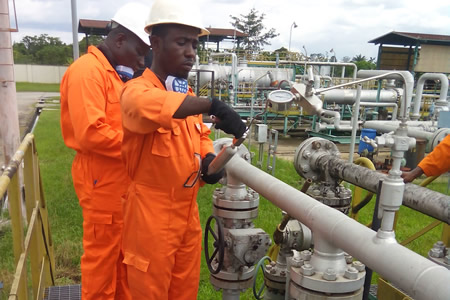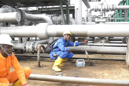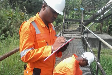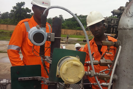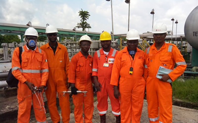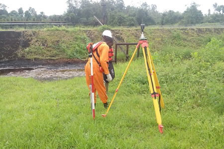 Surveyors and technicians acquiring positional data at Akri / Oguta Flow Station